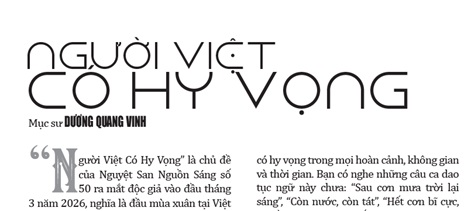 “Người Việt Có Hy Vọng” là chủ đề của Nguyệt San Nguồn Sáng số 50 ra mắt độc giả vào đầu tháng 3 năm 2026, nghĩa là đầu mùa xuân tại Việt Nam, những ngày hương vị và hương thơm của Tết vẫn còn vương vấn vào lòng người.
